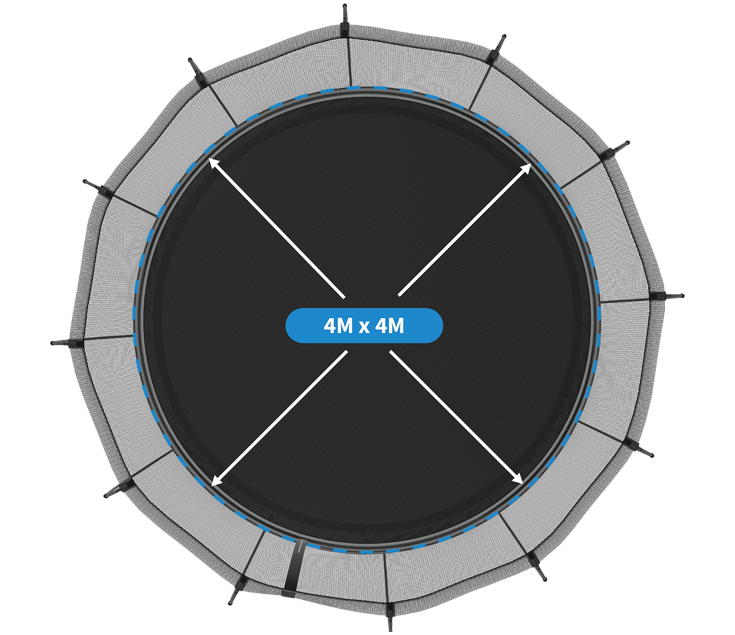 Durable galvanized steel frame positioned underneath the jumping surface, well out of harm’s way.