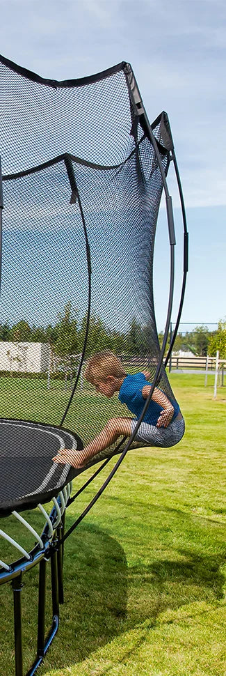 Patented UV-stabilized FlexiNet is built using a lockstitch knitting method with a “non-rip” weave. It is the strongest enclosure net you will find on a trampoline.